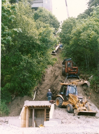 Description: Installation of a 450mm diameter steel pipe for a storm sewer between the US and Canadian borders. Installation of a 600m storm outfall, a concrete outfall structure, and a storm and sanitary main. Highlights included descending 70m on a 50 plus degree slope and the installation of a concrete dissipation chamber. Maximum slope 87.33%.