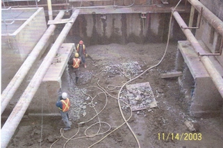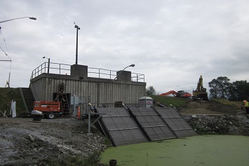 Description: Installation of an automated debris screen system. Work involved dewatering a watercourse for the construction of a cast-in-place concrete slab; installation of an automated debris screen, stainless steel piping, electrical conduit, level transducers, and control kiosks.